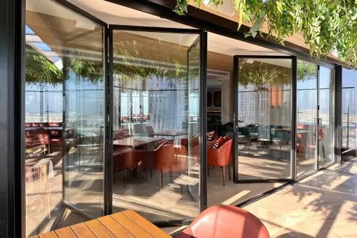 Large minimalist folding doors, perfect for protecting rooms and enjoying the views. Glass panels up to 16.4 ft high, ultra-thin profiles and a great U-value from 0.25 Btu/hft²F.