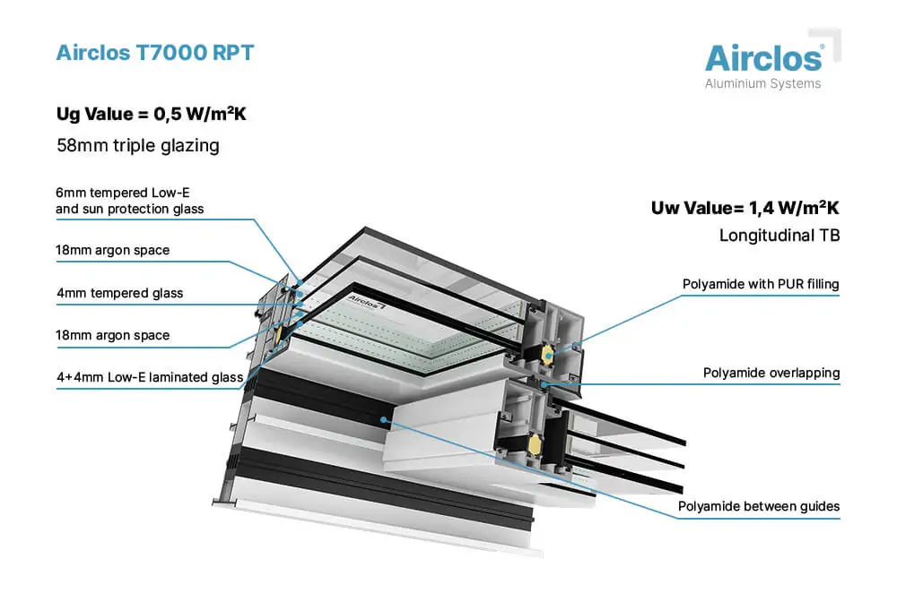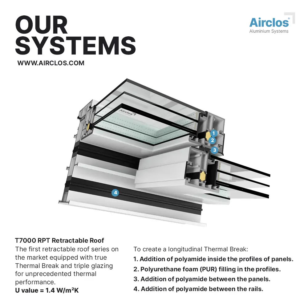Airclos' T7000 RPT series of retractable roofs is the first on the market featuring a longitudinal Thermal Break that covers all points of contact between the outdoors and indoors, minimising thermal transmittance between spaces.