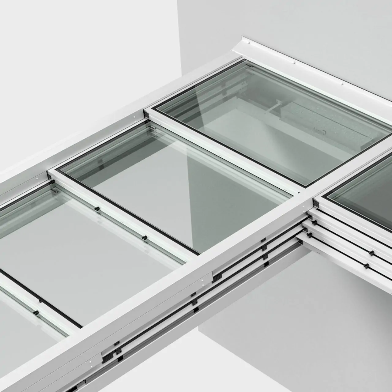 Sistema de envidraçamento que cria uma superfície completamente plana e estanque entre a estrutura e os vidros.